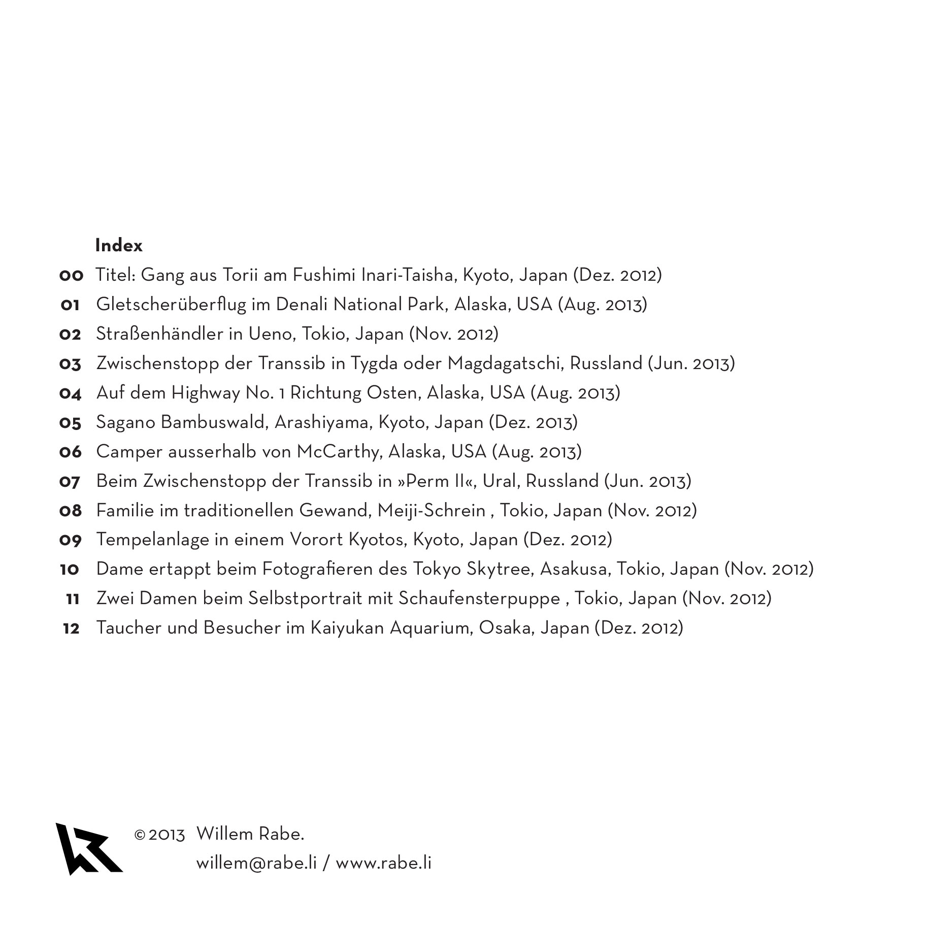 In 2013, I had the opportunity to travel Japan, Russia and Alaska. Some pictures taken during these travels I compiled into a calendar that was printed in an edition of 50 and shared with friends and fellow travellers.